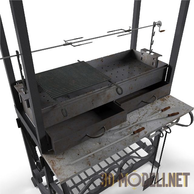 Состаренный кованый мангал «Универсал» производства компании «Стал». Мангал оснащен съемным дном, регулятором поддува (выдвижными ящиками). Идет в комплекте с вертелом, шампурами, кочергой и совком. Пригодится для использования на даче или при проектировании загородного дома.