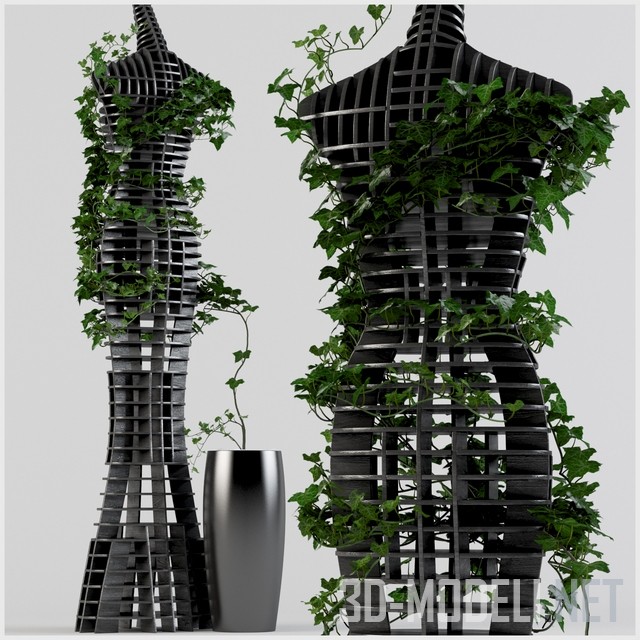 Современная композиция для украшения ландшафта, можно интерьера. Манекен в виде женского силуэта, собранного из вертикальных и горизонтальных элементов в трехмерную модель. Детали изготовлены из крашеной в графитовый фанеры. Манекен увит плющом. Габарит манекена: 1650 х 265 х 400 мм. У ног манекена стоит высокий современный черный горшок, из которого и растет плющ. Верхний слой грунта декорирован белой галькой.