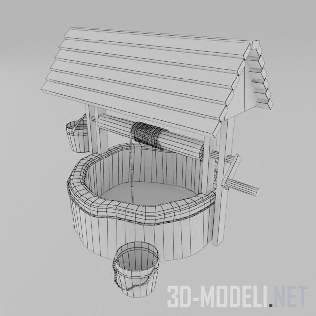 Рустикальный колодец с круглыми бортами из серого камня и с деревянной крышей на столбиках. Крыша двухскатная из старого дерева. Под крышей – горизонтальный вал с намотанным канатом и старое ведро, подвешенное на крюк.