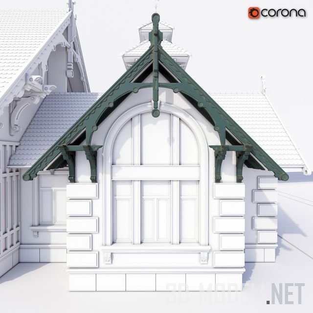 Конструкция двухскатной кровли в старинном стиле со стропильной частью, коньком и декоративными, резными фронтонными планками, консолями и коньковой рострой. Резные элементы напоминают древнерусские образцы архитектуры с волнистыми линиями и кругами. Конструкция выкрашена в приглушенный сине-зеленый цвет с рыжеватой патиной на резьбе. Модель с текстурой в архиве.