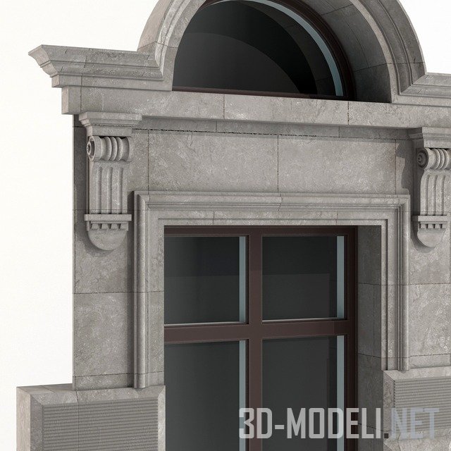 Элемент классического фасада с прямоугольным окном и небольшим арочным окошком. Можно использовать как модульный компонент для построения архитектурной сцены. Качественная, профессионально выполненная 3d-модель.