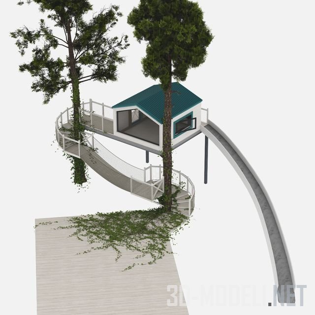 Интересный игровой объект, дом на дереве. Размер домика: 2,2 х 2,5 м. В комплекте винтовая лестница, подвесной мост, детская площадка, два дерева, плющ.