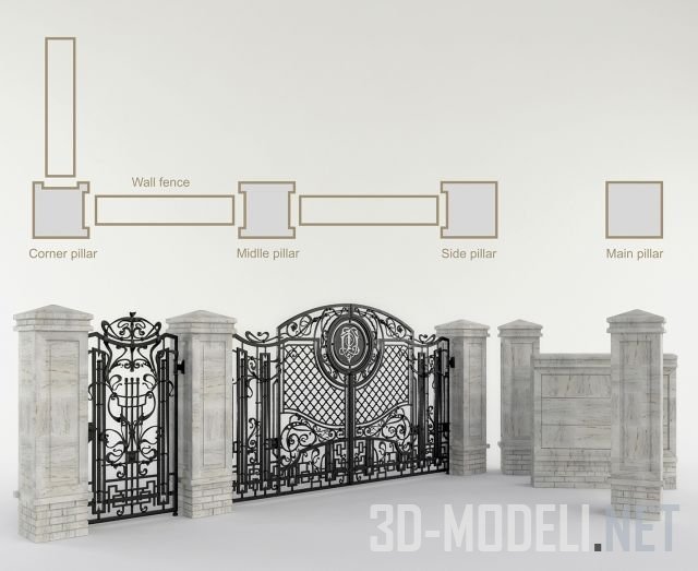 Комплект элементов для забора в стиле барокко с коваными решетками, столбами и каменной секцией. Столбы представлены с кирпичным цоколем и рельефными панелями на четырех плоскостях, в четырех конструктивных вариантах: угловой столб, средний, концевой и столб без прорезей под карту секции. Широкие, квадратные в сечении столбы накрыты четырехскатными квадратными крышками. Секция ограды выполнена в комплект к столбам: с кирпичным цоколем и прямоугольным фризом по периметру фронтальной плоскости. Представлены, также, кованые калитка и ворота с изысканным орнаментом, вензелем и решетками черного цвета.