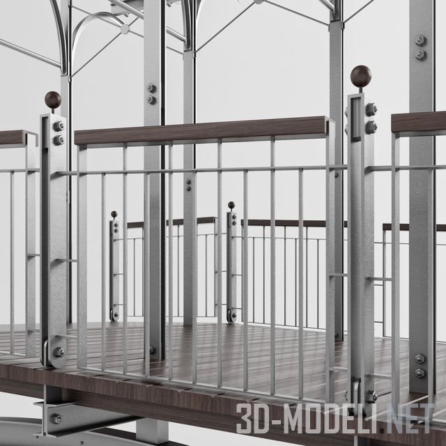 Небольшая секция пешеходного моста в викторианском стиле с двухскатным навесом на арочных стойках и деревянным настилом. Конструкция, собранная из стальных элементов с проклепанными узлами, опирается на пару изогнутых в дуги двутавров. Аркада опор кровли и лаконичные металлические перила с шариками на столбиках и деревянными накладками на верхних кромках перил формируют красивый, ажурный облик конструкции.