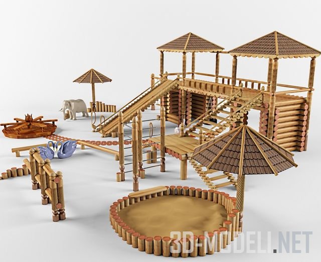 Деревянный развлекательно-игровой комплекс для экстерьерных проектов. Реалистично выполненная трехмерная модель с текстурами.