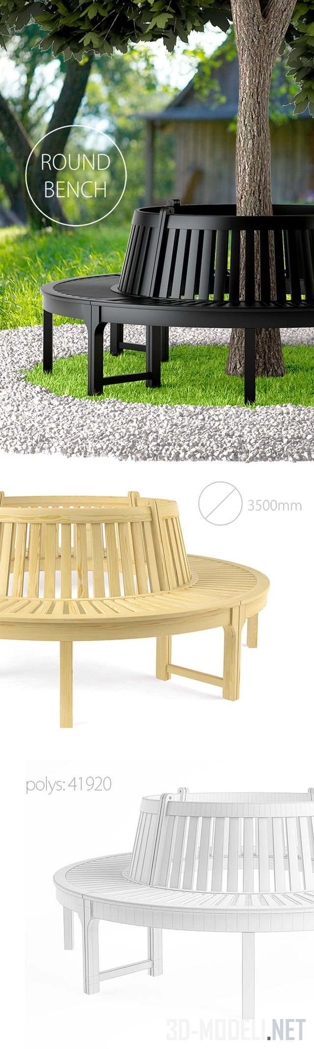 Качественно и реалистично выполненная трехмерная модель садовой скамьи, опоясывающей дерево. Круглая форма скамейки (диаметр 3500 мм) делает ее эргономичным экстерьерным элементом.