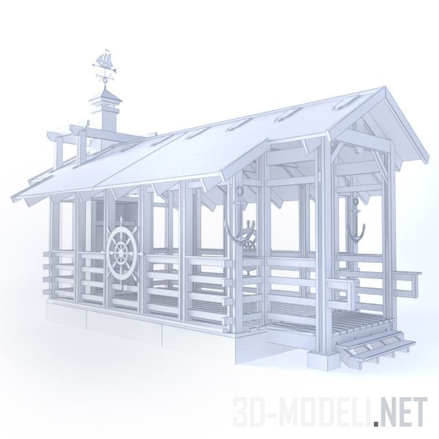 Садовая беседка со ступеньками и синими перилами, на которых прикреплен макет штурвала корабля белого цвета. В беседке есть манкал, на трубе которого установлен флюгер в виде парусника.