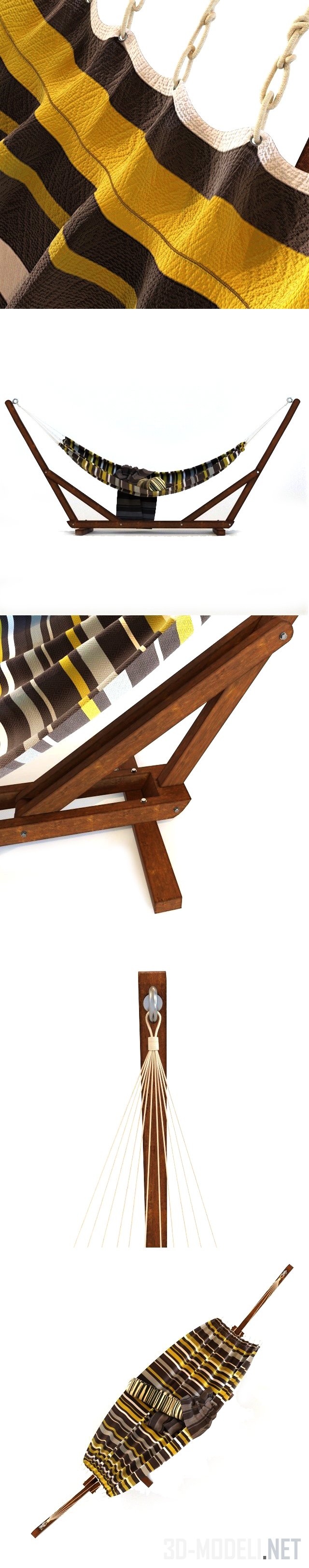 Гамак с мягким полосатым матрацем. Гамак крепится к деревянному основанию коричневого цвета.