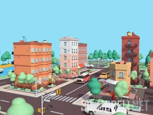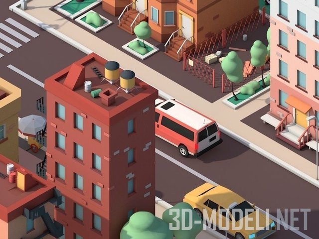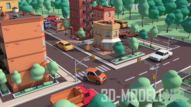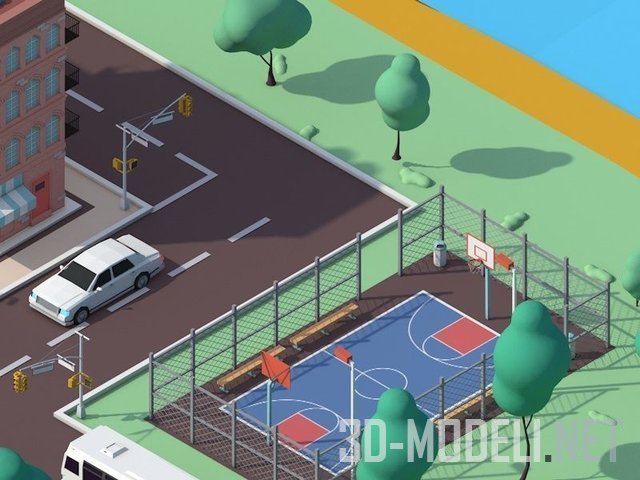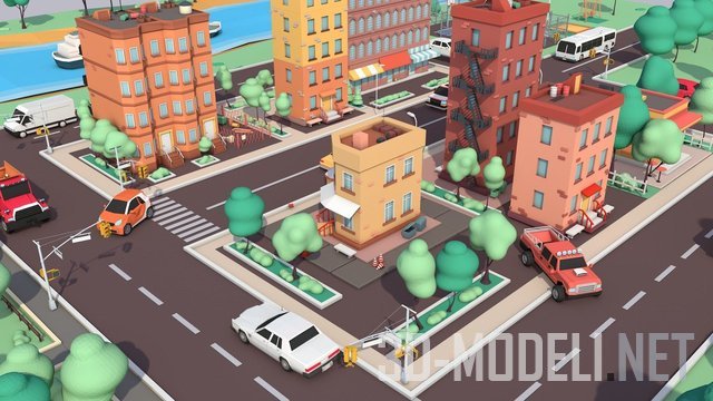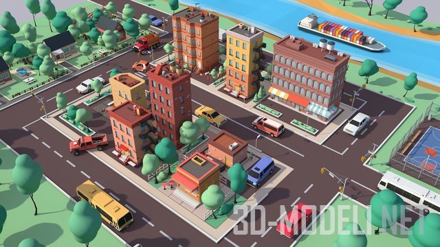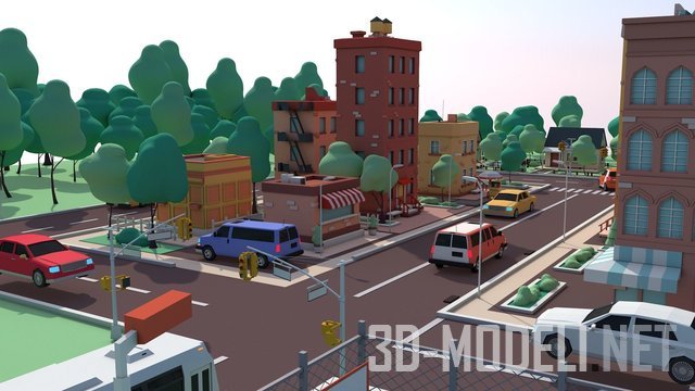 Отличный ассет для использования в игровых проектах: набор Low-Poly 3d-моделей американской городской инфраструктуры, такой себе "город мечты": дома, улицы, игровые и спортивные площадки, модели транспорта, деревья и кусты, а также многое другое. Также в комплекте разные элементы экстерьера: лавочки, уличные фонари, урны, клумбы, ограждения и многое другое - все в готовой, собраной 3D-сцене! Можно сразу использовать как игровой уровень на движке типа Unity или Unreal Engine.