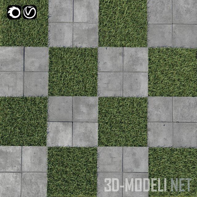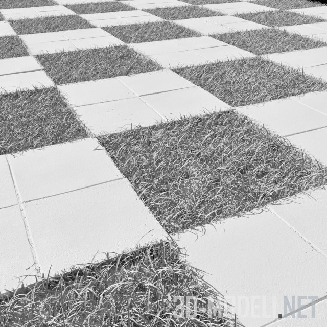 Стильный и современный вариант для формирования ландшафта – бетонная плитка в квадратном формате, с квадратами зеленой травы между ней (шахматная раскладка).