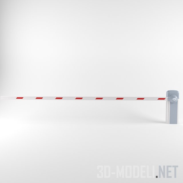 Современный шлагбаум DoorHan для установки на въезде во двор, на парковочные площадки и т.д. Стойка и механизм выполнены в сочетании белого и светло-серого, штанга белая, с наклонными красными полосами. Реалистичная трехмерная модель для экстерьерных проектов.