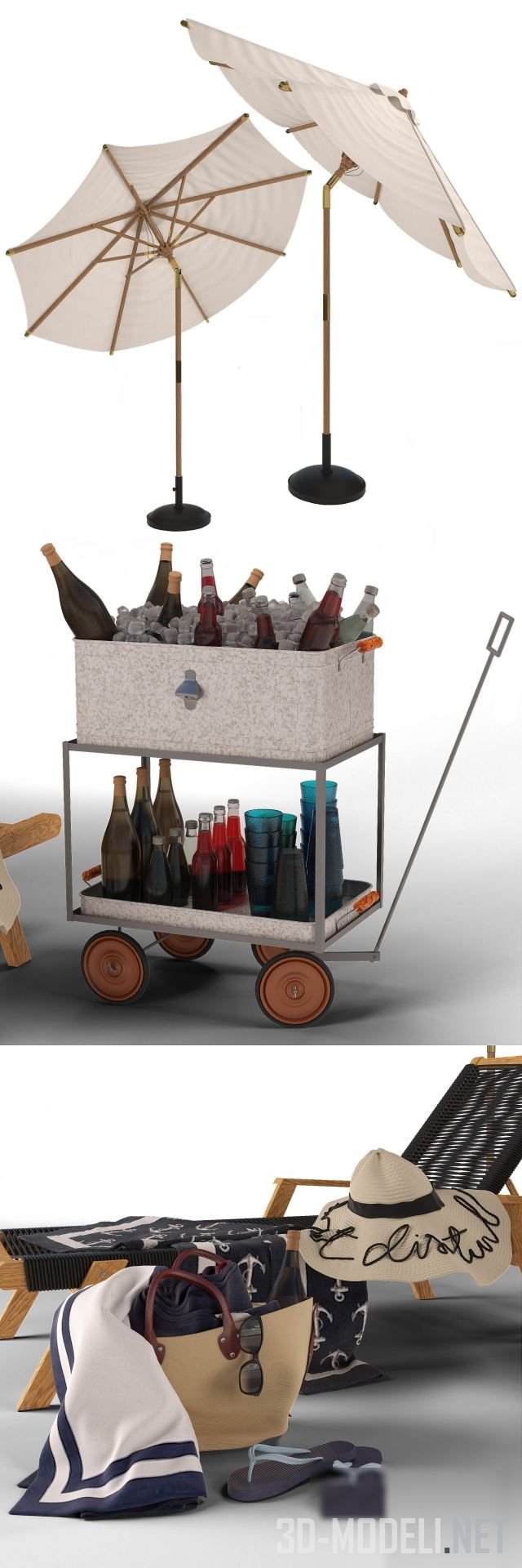 Шезлонг PALMER ROPE, с небрежно наброшенной шляпой и полотенцем, с сумкой и шлепанцами, тележка с холодными напитками, пляжный зонт – в этом наборе от Pottery Barn есть все, чтобы классно отдохнуть на пляже.