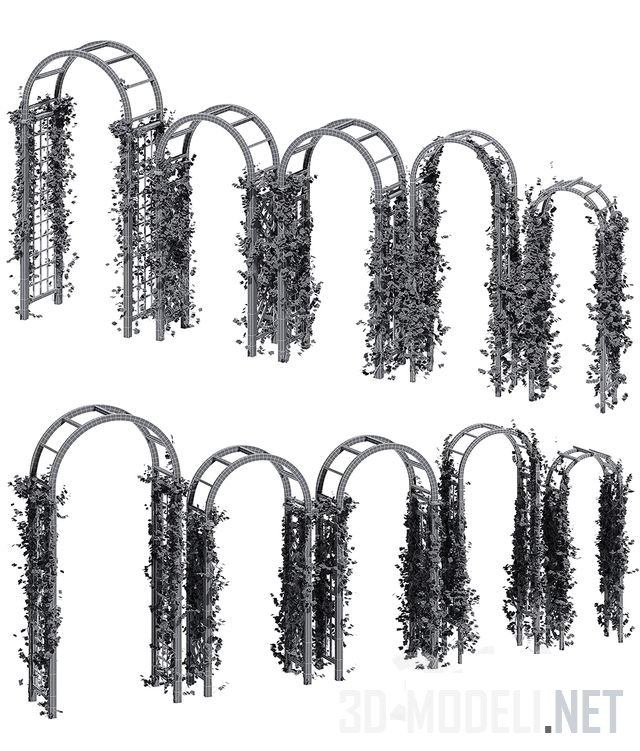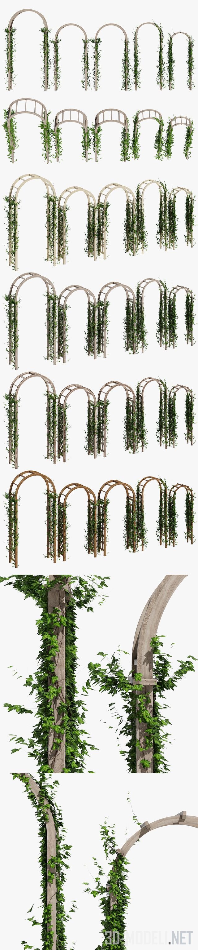 Арочные подпорки для вьющихся растений в саду. Представлены изделия нескольких типоразмеров и с небольшими конструктивными отличиями. В наборе Forest Garden Florence Arch, Rowlinson Round Top Arch, Grange Elite Arch, Traditional Rose Garden Arch. Размеры: 3,04 х 1,46 х 0,8 м; 2,5 х 1,24 х 0,65 м; 2,54 х 1,0 х 0,445 м; 2,2 х 0,8 х 0,48 м.