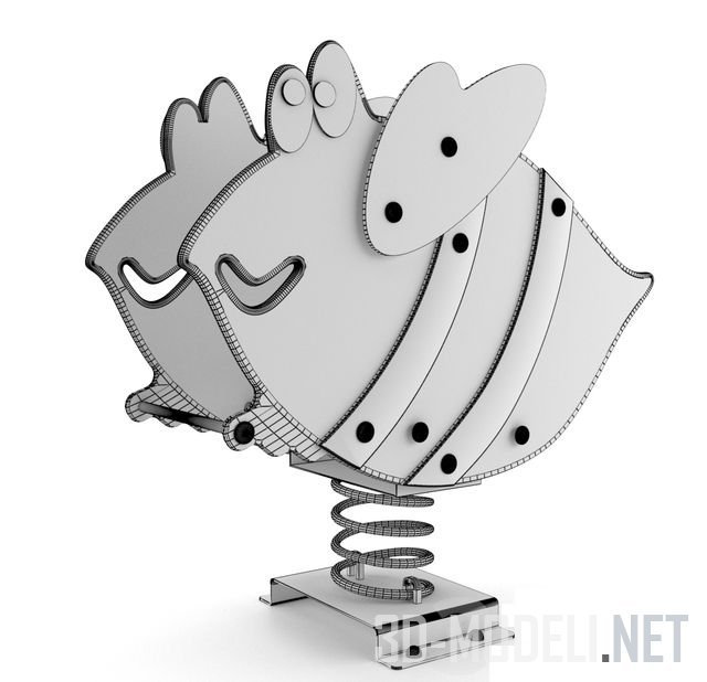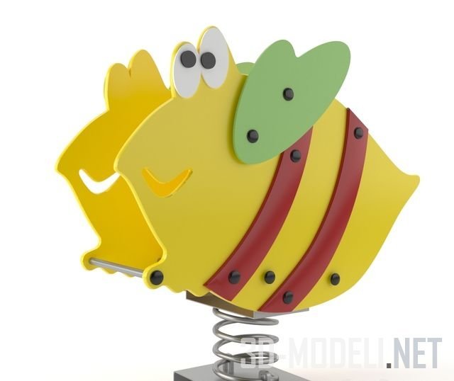 Качалка для детской площадки - забавная пчелка. Основой конструкции служит мощная металлическая рессорная пружина. На ней смонтировано небольшое сиденье с подставкой для ног. Борта качели выполнены в виде силуэта желтой пчелки с красными полосками на теле и небольшими зелеными крылышками. Элементы вырезаны из толстой фанеры.