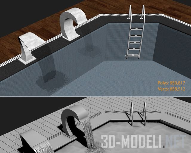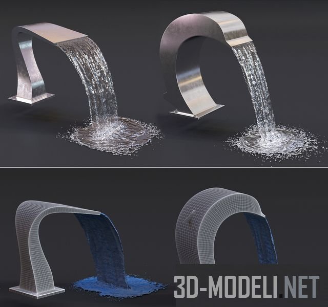 Два водопада из нержавеющей стали, закрепленные на бортике бассейна с водой. В бассейн с бортика спускается небольшая металлическая лесенка. Отличная модель для экстерьера и интерьера.