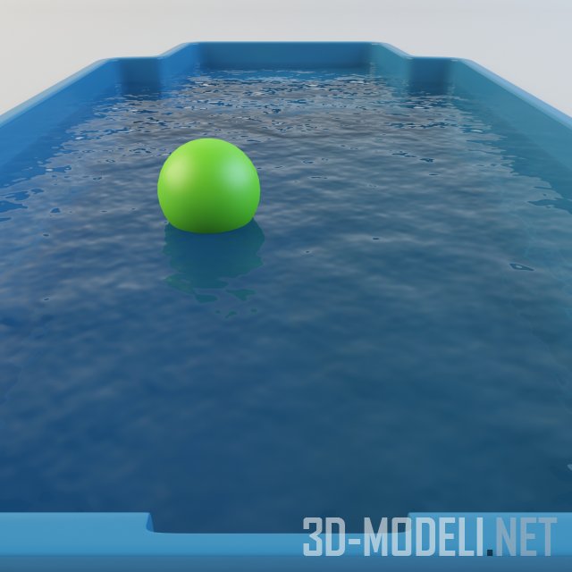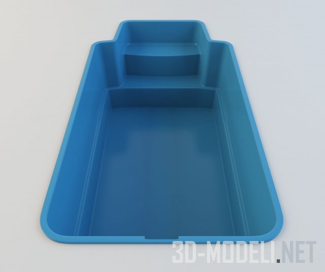 Бассейн из композитного материала синего цвета. Размеры бассейна: длина 6000 мм, ширина 3000 мм, глубина 1700 мм. В бассейне налита. На поверхности воды находится большой мяч салатового цвета.