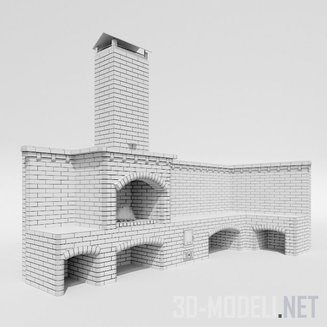 Барбекю от STOZIM. Угловой стационарный комплекс из красного кирпича для приготовления барбекю во дворе частного дома. Габариты: 5,7х2,2х3,9м. Над топкой печи установлен более высокий дымоход. В конструкцию включена топка гриля, дровяная печь, рабочие поверхности, ниши для дров и посуды. Верхняя кромка стены украшена карнизом из двух рядов кирпича.