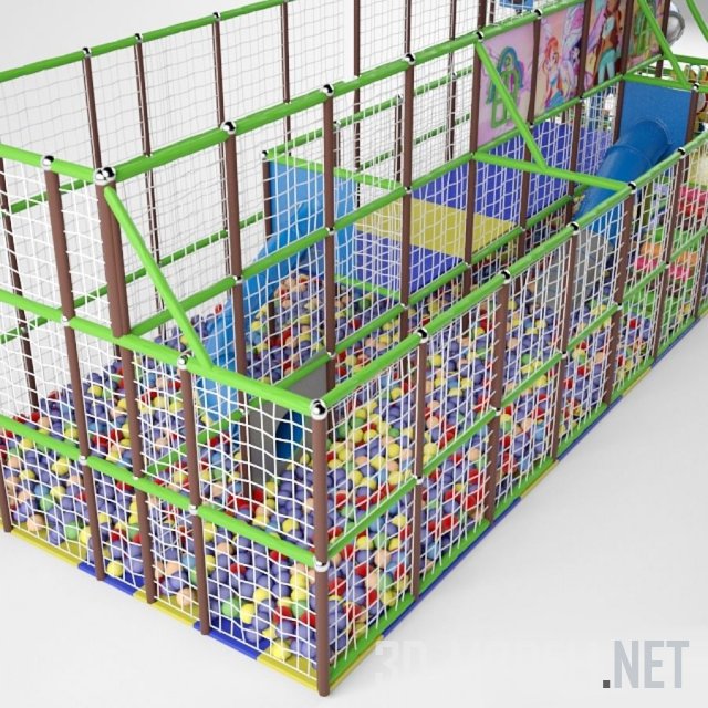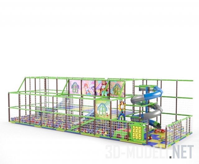Конструкция для развлечения и веселья детей, лабиринт с набором локаций. Горка, лесенки, шарики, игрушки и другие элементы образуют отличный аттракцион для использования в парках или в пространстве гипермаркетов.