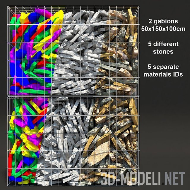 Конструкция из четырех и из двух сетчатых проволочных металлических прямоугольных контейнеров, заполненных кусками распластованного песчаника. Габионы используются, как подпорные элементы в ландшафтном дизайне, для зонирования и декорирования сада. Габарит одного габиона в конструкции: 50 х 100 х 150 см.