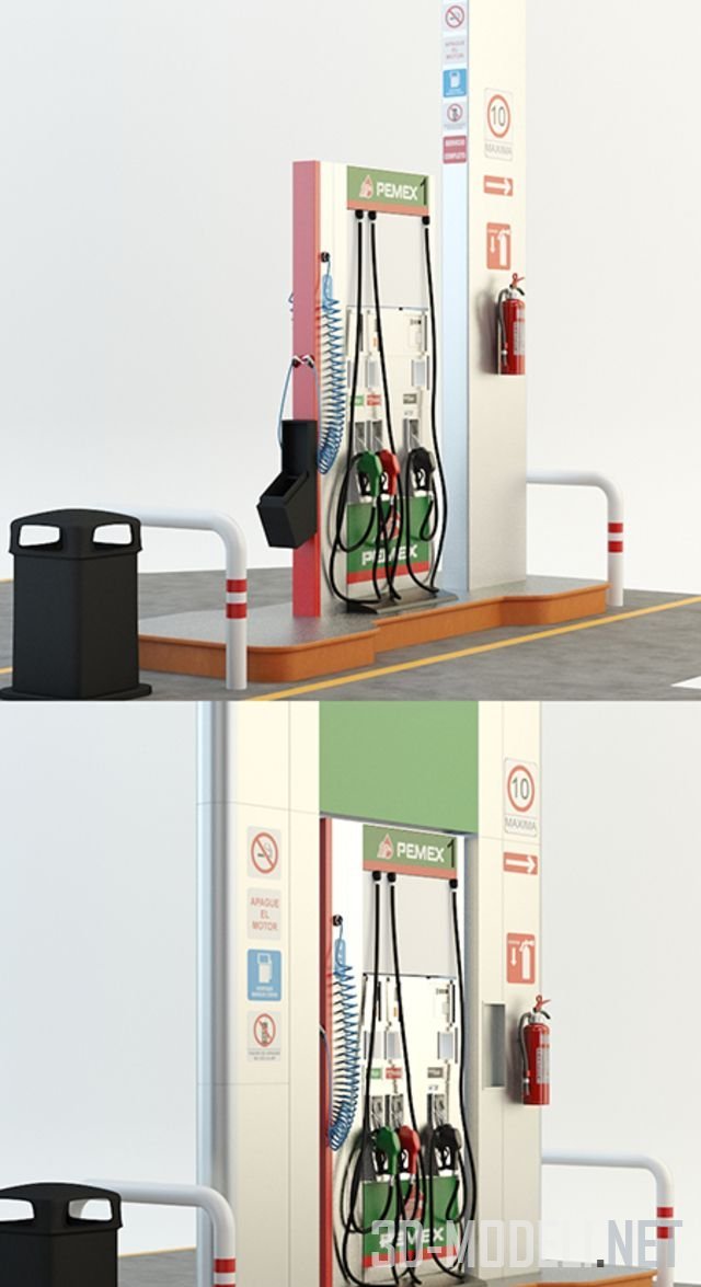 Элемент заправочной станции для автомобилей – PEMEX. Два варианта колонок на несколько заправочных пистолетов, с колонной навеса, ограничительными трубами, мусорным контейнером, огнетушителем и различными стикерами и информационными надписями.