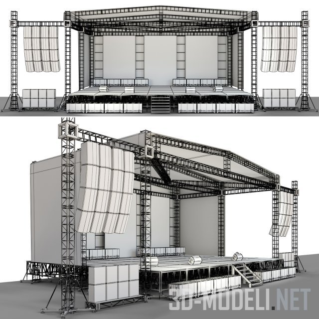 Современная мобильная концертная сцена для стадионов и площадей. Конструктив сцены состоит из трубчатых металлических модулей и ферм, собранных в павильон с навесом, боковыми и задней стенками и фермами для акустических колонок справа и слева от сцены. Акустические системы с мониторами на сцене, сабвуферами и основными рабочими колонками, мобильные контейнеры, интегрированные в общий конструктив, яркий принт на заднике сцены- все тщательно проработано. Общий габарит: 20 х 15 х 10 м.