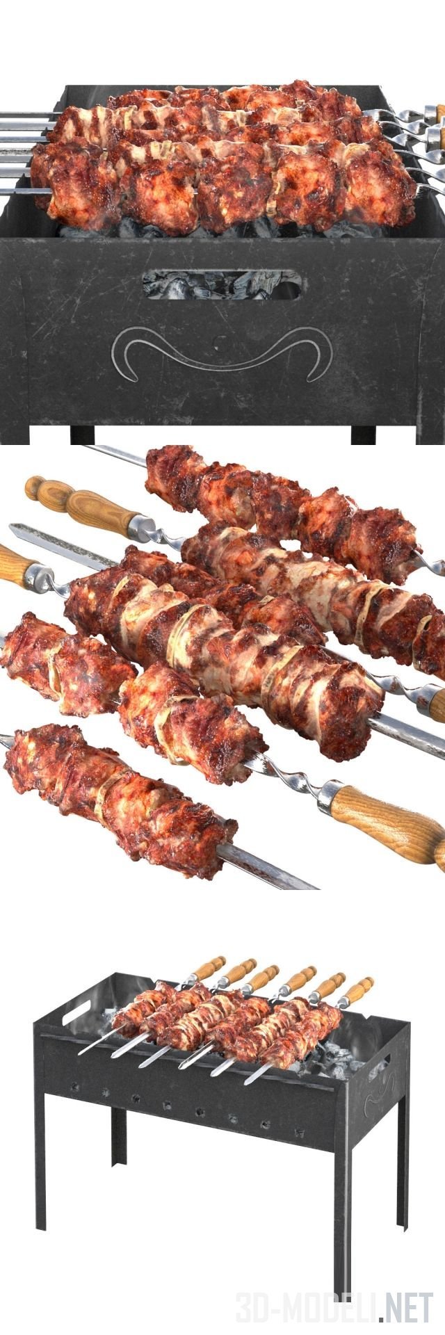 Простой металлический переносной мангал с углями и шестью шампурами с деревянными точеными рукоятками, с нанизанными на них кусками мяса. Шашлык уже поджарен и источает умопомрачительный аромат. На боковой плоскости мангала небольшой декоративный завиток.