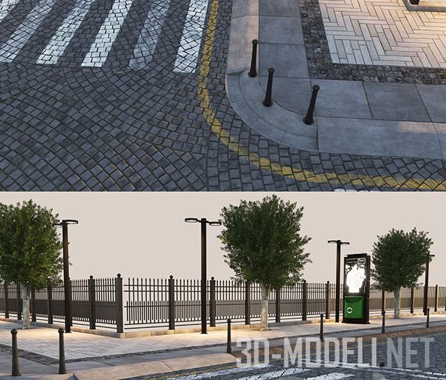 Сет для экстерьерных проектов, особенно полезен для городской среды. Есть все необходимые элементы: брусчатка для дороги и тротуара, заборы, мусорный бак на солнечных батареях, дерево фикус Бенджамина и скамейки. Уличные фонари, остановка, перекресток с переходом.