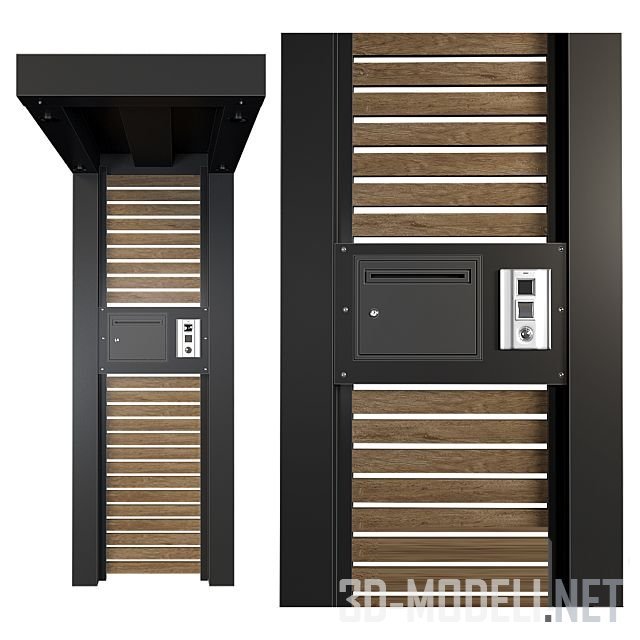 Современная входная группа для дома от производителя PROEM. В комплекте металлические двери с декоративными панелями. Навес представляет собой профилированный металлический лист с декоративными деревянными вставками. Почтовый ящик, домофон, уличный фонарь, мусорный бак входят в набор и позволяют полностью укомплектовать вход.