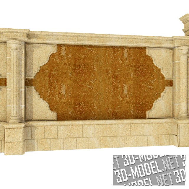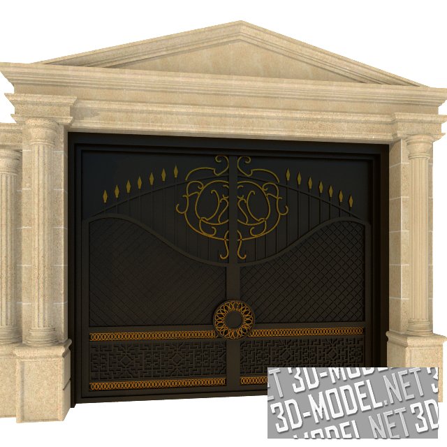Каменный забор из блоков и декора и крупные двухстворчатые ворота с коваными элементами и каменным порталом над створками в стиле ампир. Столбы секций забора украшены полуколоннами с каннелюрами. Цоколь забора имитирует кладку из квадратных блоков. По верхней кромке секций выполнен декоративный фриз. Плоскости секций декорированы охристой декоративной штукатуркой в стиле «венецианской». Столбы с полуколоннами, цоколь, венец и вставки-уголки на секциях - желтоватый туф. Портал над воротами - с треугольным фронтоном. Черные плоскости ворот украшены золотистыми вензелями, пиками, орнаментом.
