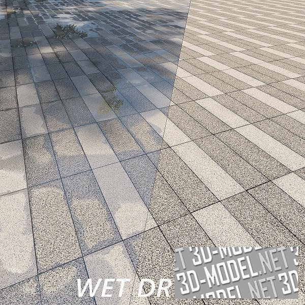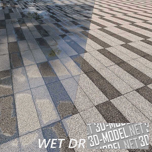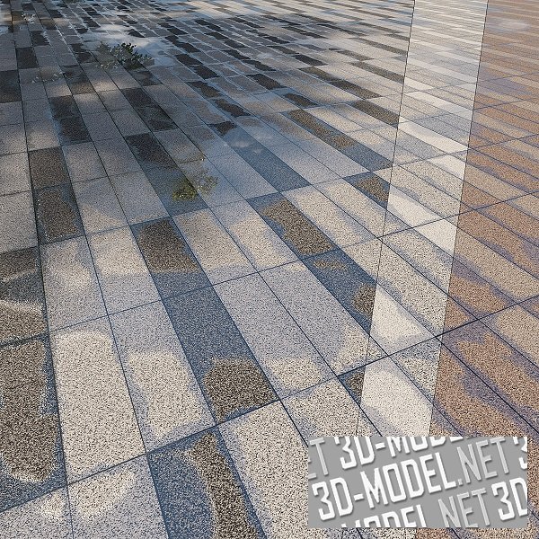 Несколько подвариантов тротуарной плитки Paving Belpasso. Прямоугольные плитки в наборке из двух оттенков представлены в сухом варианте и в эффектном варианте «после дождя», где плитка местами сухая, местами - с лужами, а местами - частично высохшая. В коллекции - четыре оттенка.