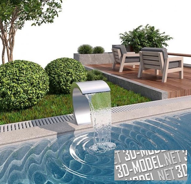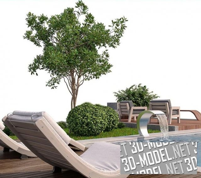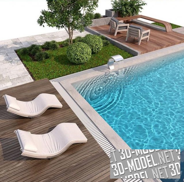 Открытая площадка с зоной отдыха, растениями и бассейном. Напольные покрытия трех типов: светло-серая плитка и террасная доска двух цветов. Территория разбита на отдельные небольшие зоны: с креслами и столом, современными шезлонгами, газоны с растениями.