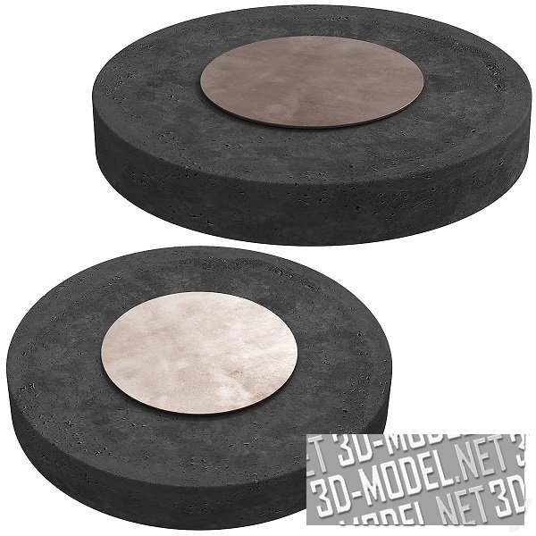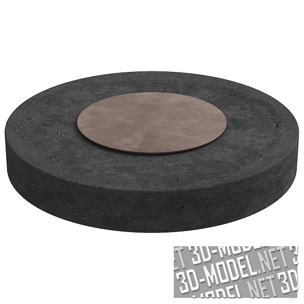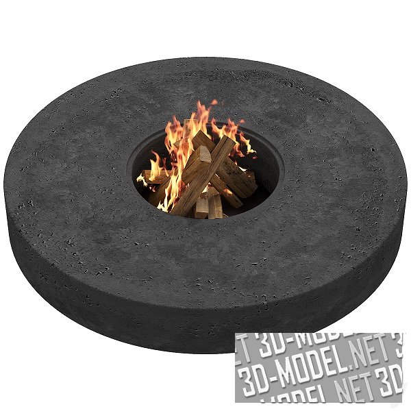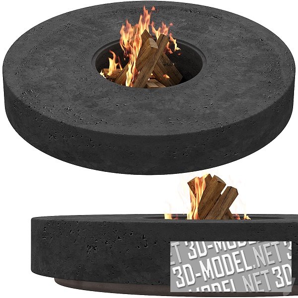 Кольцеобразный барбекю для размещения на костровой поляне в зоне отдыха. Низкий цилиндр из темного травертина с круглым отверстием внутри представлен в двух состояниях: с горящими в очаге дровами и накрытый круглой крышкой.