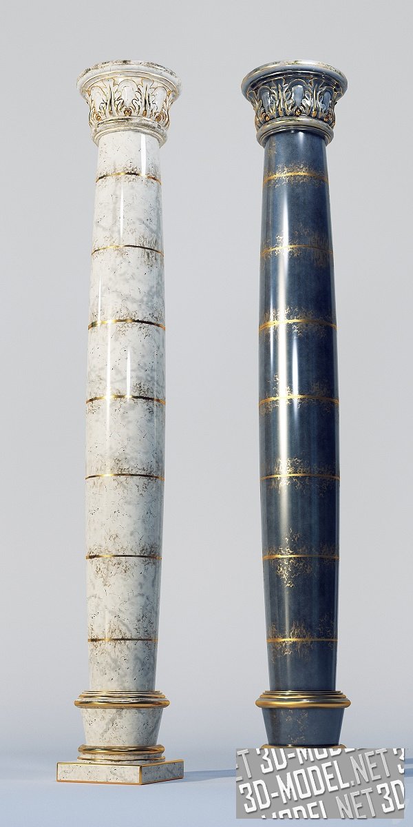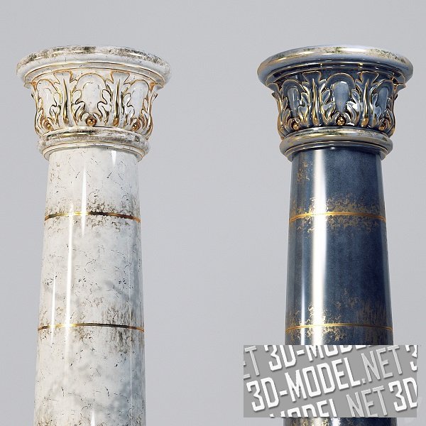 Круглые мраморные колонны в классическом стиле в двух вариантах: белый мрамор с серыми прожилками и темный. Тело колонн слегка расширено в средней части. По всей высоте тела колонны (горизонтальными равномерными полосами), по ребрам рельефов базы и капители нанесен тонкий золотистый декор в виде патины и трещин.