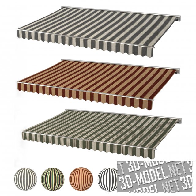 Тканевые раскладные маркизы в шести декорах. Прямоугольный тент с одной волнистой гранью по длинной стороне, закреплен на раздвижном каркасе из алюминиевого профиля. Спокойные сочетания полосок (темно-красного с бежевыми, серые с белыми, серо-синие и серо-зеленые полоски и прочее) отлично впишутся в интерьеры летних кафе в средиземноморском стиле.
