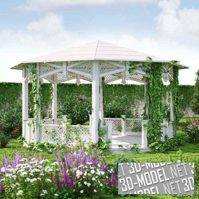 Восьмиугольная беседка выполнена в классическом стиле. Изготовлена из дерева. Представляет собой привлекательный объект архитектуры. В просторной белой беседке можно разместить обеденный стол на 10 персон и отлично провести время.