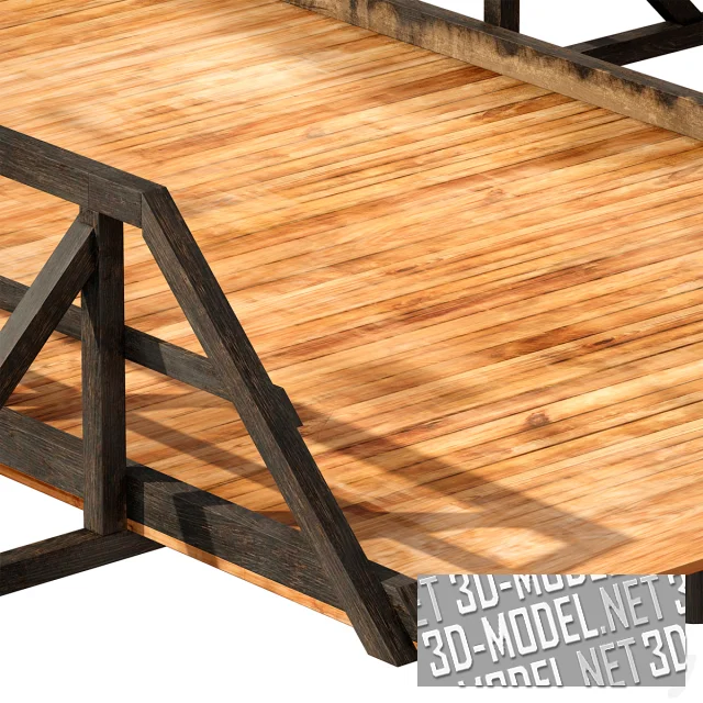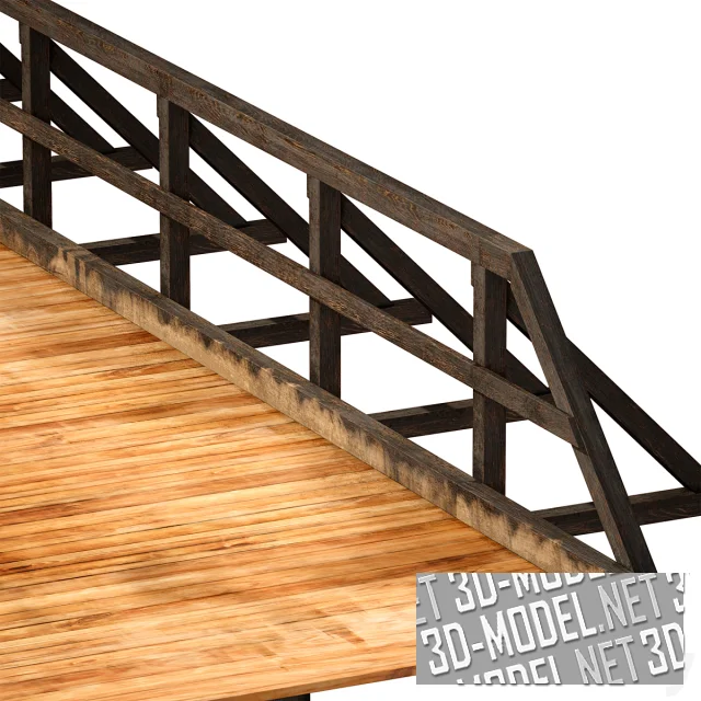 Небольшой мост через реку, с настилом из дерева, перилами из бруса и бревенчатыми опорами. Габарит 12х7х3м.
