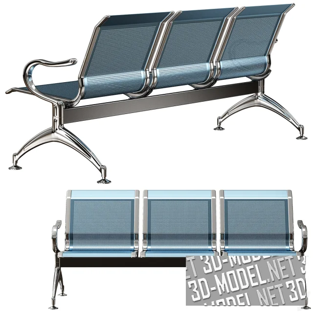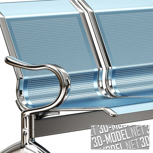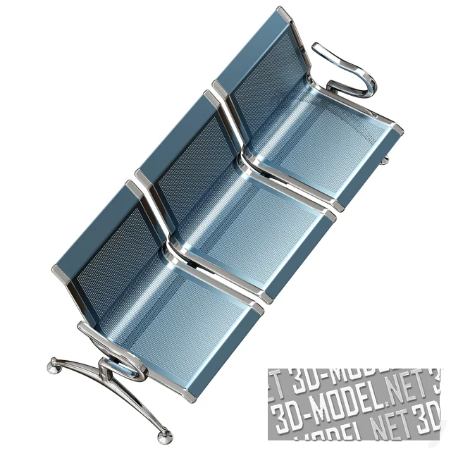 Современная металлическая трехместная скамья с подлокотниками - SJ-8888 от Oshujian, для использования в городских инфраструктурных объектах и местах массового пользования. Сиденья со спинкой разделены на три отдельные части, с заполнением плоскостей голубоватым листовым металлом с мелкой круглой перфорацией. Основная рама и ножки с возможностью небольшой регулировки - серебристый полированный металл.