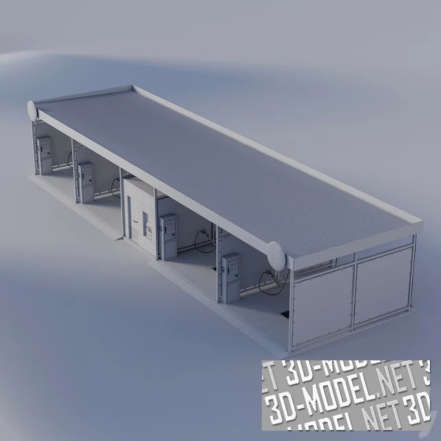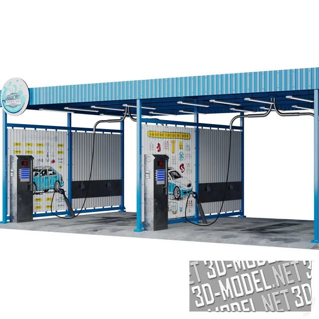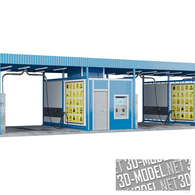 Современная автомобильная мойка самообслуживания на четыре бокса, объединенных одной конструкцией с общей плоской кровлей и перегородками из профлиста. По центру конструкции в голубых тонах, оборудована кабинка оператора. На верхнем парапете висят круглые вывески. На перегородках нанесены схемы, инструкции и реклама. В каждом боксе установлено современное оборудование.
