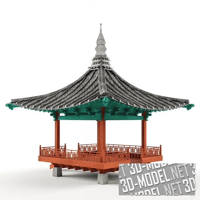 Декоративная беседка в корейском стиле. Деревянная квадратная платформа с решетчатыми бортами установлена на четырех серых бетонных столбах. На четырех колоннах - характерная крыша пагоды с серой черепицей «чешуя дракона» и декоративным пиком на верхушке четырехскатной кровли. Подкрышное пространство (балки, консоли и свесы) - бирюзового цвета. Габарит беседки: 8,5х8,5х9,65м.