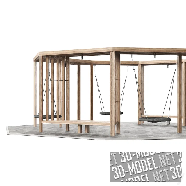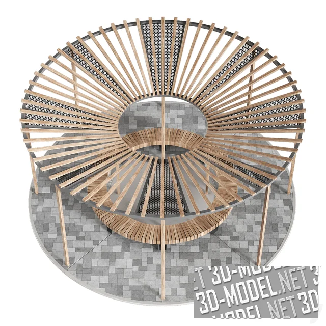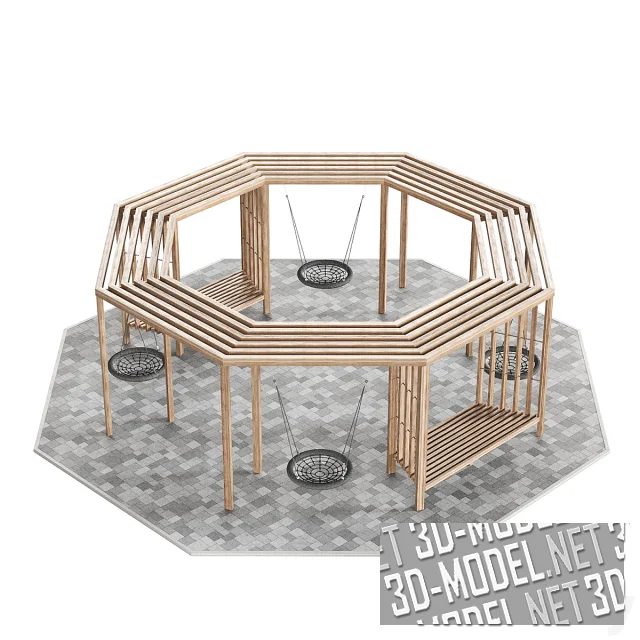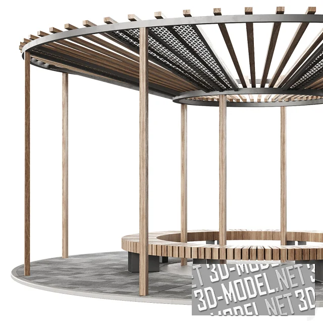 Два варианта деревянной перголы. Первый – круглый навес и расположенная по кругу скамья, второй – многоугольное сооружение с подвесными качелями. Это отличное место для отдыха и веселого времяпровождения.