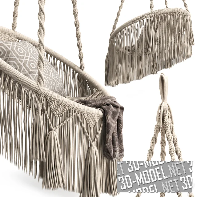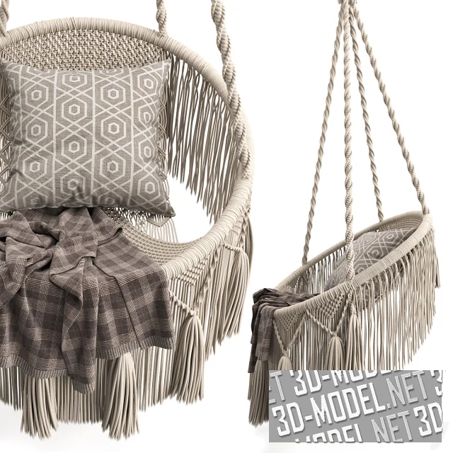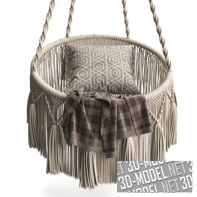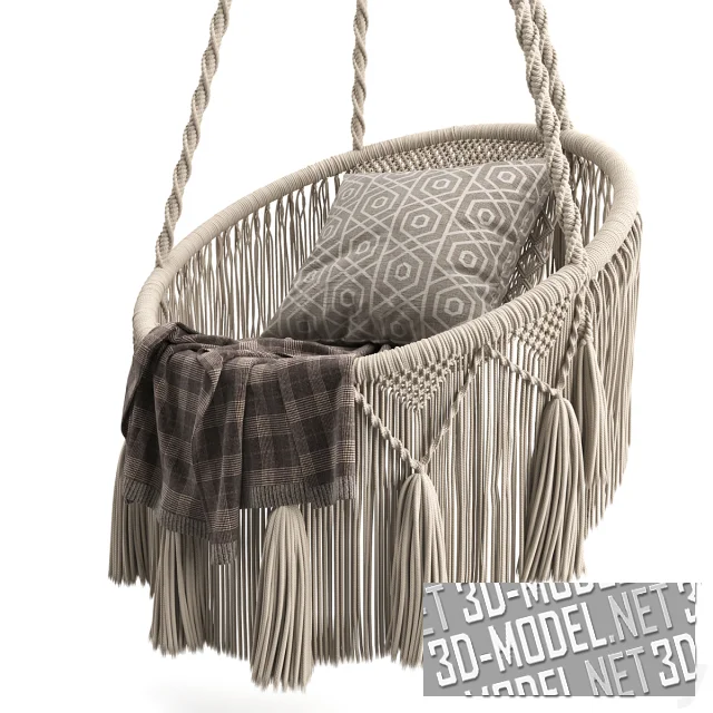 Подвесные качели в стиле макраме. Сиденье смонтировано на основе металлического обруча, подвешенного на четырех канатах с декоративной веревочной оплеткой. С обруча свисает длинная бахрома, декорированная крупными кистями. Качели дополнены квадратной подушкой с геометрическим бело-песочным паттерном и клетчатым пледом в коричневых тонах.