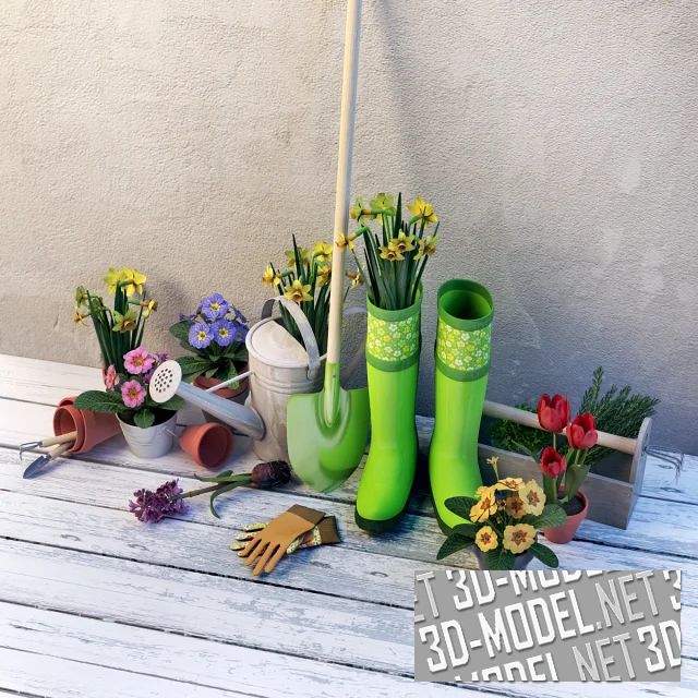 Набор аксессуаров голландского бренда Esschert Design послужил вдохновением для этого декоративного набора для сада или огорода. Когда растаял снег, пора приниматься за работу - здесь собрано все необходимое. Резиновые сапоги и перчатки, инструменты, горшки с рассадой и лейка выполнены очень реалистично. 3d-модель с материалами Vray и Corona. Для красивых и детальных рендеров.
