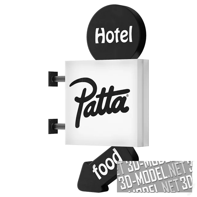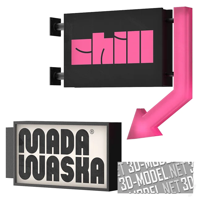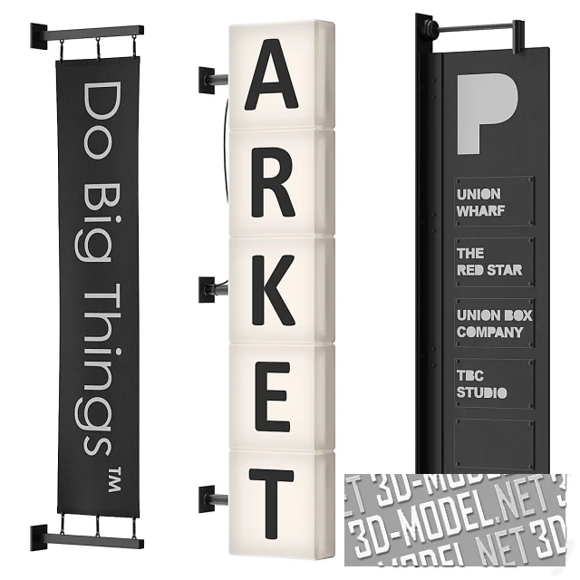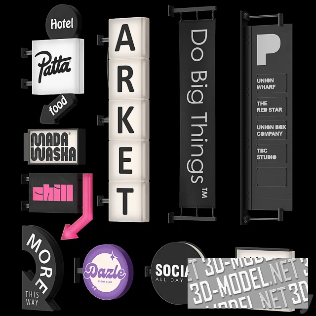 Для различных экстерьерных проектов, визуализации городской среды потребуется множество предметов для детализации и достоверности - например, этот набор из десяти консольных табличек-вывесок для различных заведений. Каждая табличка имеет свою отдельную черно-белую текстуру (при необходимости можно изменить цвет или заменить логотип на любой другой).