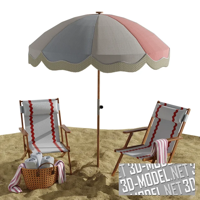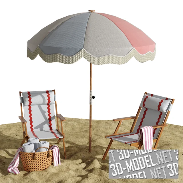 Комплект мебели и аксессуаров для отдыха на открытом воздухе. Удобное кресло обеспечивает комфорт во время пребывания на пляже. Широкий пляжный зонт надежно укрывает от прямых солнечных лучей. Дополняет композицию плетеная корзина с полотенцами.
