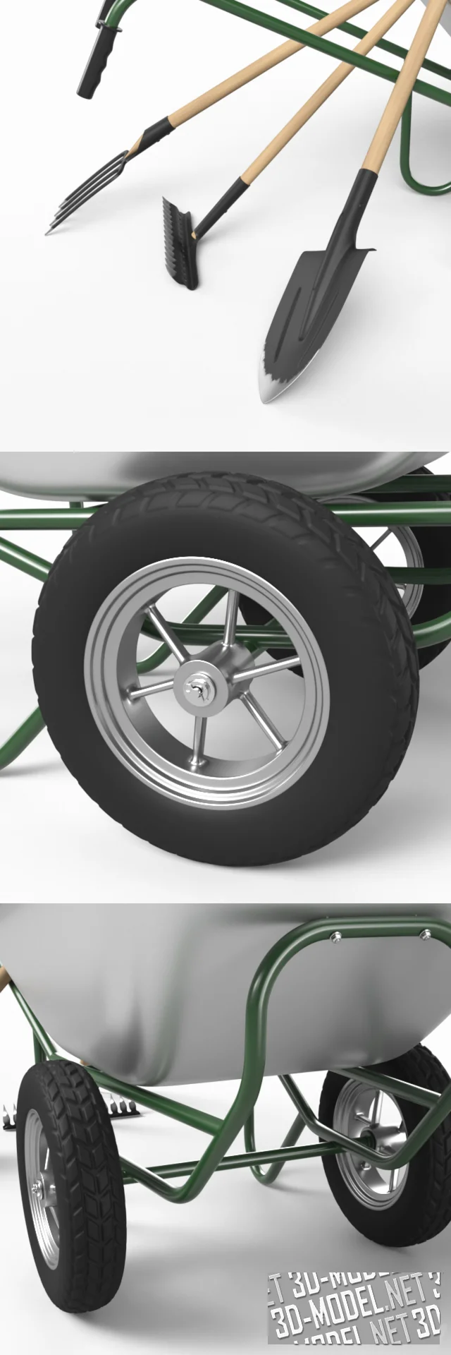 Комплект для ландшафтных работ: вместительная тачка на двух колесах, штыковая лопата, грабли и вилы. Пропорции выверены, корыто с округлой кромкой, покрышки с выраженным протектором, металлические детали читаются вблизи – набор будет органично смотреться в гараже, возле мастерской или на террасе загородного дома.