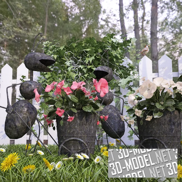 Декоративная композиция для сада, дачи, огорода, с парой воробьев. В сцене трава с желтыми цветами, металлические садовые фигурки муравьев с тележками, в которых размещены рустикальные ведра с растущими цветами, белый забор из заостренных деревянных планок, яблоня, плющ.