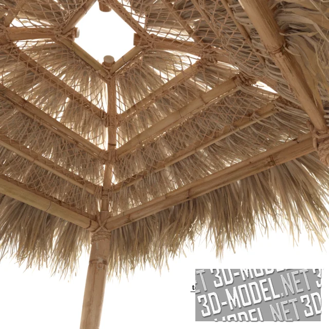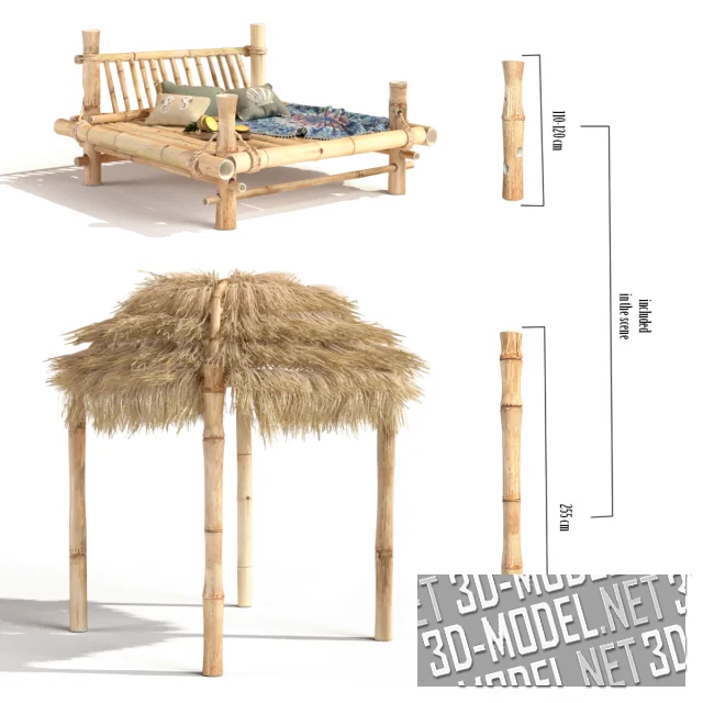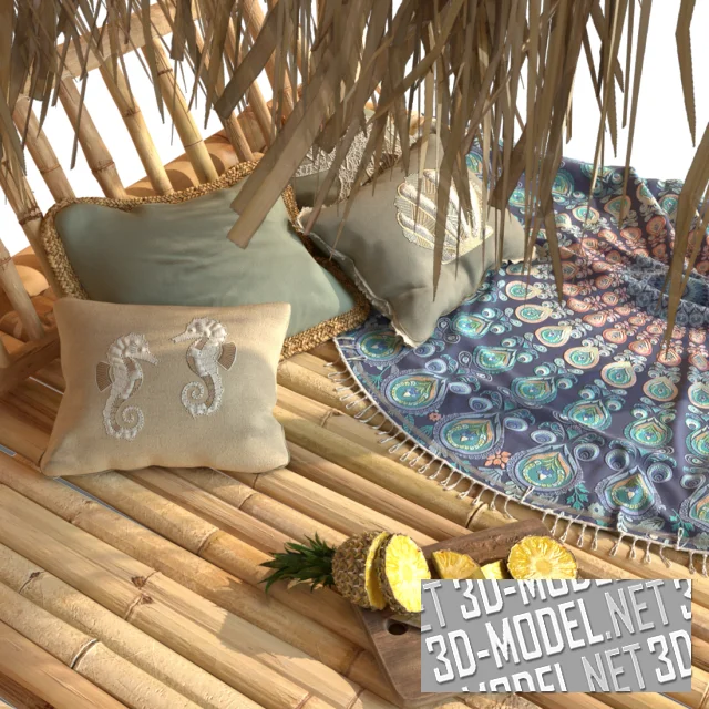 Декоративная пляжная бамбуковая хижина с двухместной кроватью и четырехскатным навесом на четырех столбах. Бамбуковый каркас кровли навеса застелен крупноячеистой сеткой и сухими пальмовыми листьями. Высота столбов навеса - 255см. Изголовье кровати (h110-120см) набрано в виде вертикальной решетки из более тонких стволов бамбука. Узлы каркаса укреплены веревками из пальмового листа. На лежаке круглый сине-бирюзовый ковер с белой бахромой и этническим орнаментом; четыре декоративные подушки в бежево-оливковых тонах с аппликациями в виде морских коньков, осьминога и ракушки; деревянная разделочная доска с нарезанным ананасом. Кровать и навес представлены как раздельные модели, и собранные в одну конструкцию.