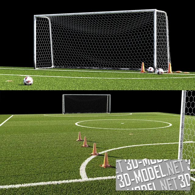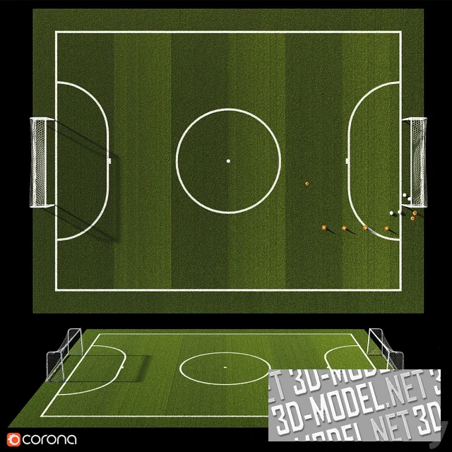 Футбольное поле с воротами, мячами и зеленым травяным покрытием. Предназначено для интеграции в открытые сцены, спортивные площадки во дворе и пр. Размеры: 18х23 м.