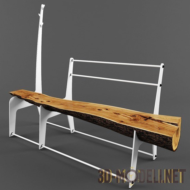 3D модель скамейки для сада, парка, сиденье которой сделано из половинки бревна. Есть текстуры.
