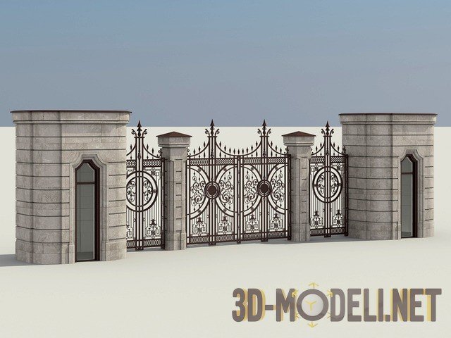 Детальная 3D-модель архитектурной группы с забором из ковки, столбами и помещениями. Секции забора имеют разную ширину, подобная группа может быть развернута в составе других строений в вашем проекте. Это высоко качественная, реалистичная модель, содержит более 700000 полигонов в сцене. Материалы - Vray.
